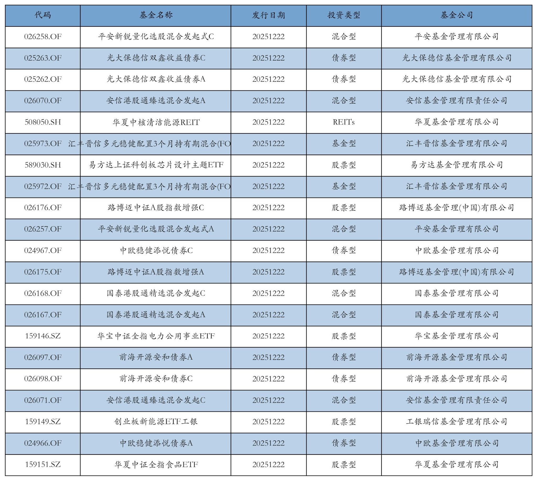 昨日有21只新基金发行,分别为:平安新锐量化选股混合发起式C、光大保德信双鑫收益债券C、光大保德信双鑫收益债券A、安信港股通臻选混合发起A、华夏中核清洁能源REIT、汇丰晋信多元稳健配置3个月持有期混合(FOF)C、易方达上证科创板芯片设计主题ETF、汇丰晋信多元稳健配置3个月持有期混合(FOF)A、路博迈中证A股指数增强C、平安新锐量化选股混合发起式A、中欧稳健添悦债券C、路博迈中证A股指数增强A、国泰港股通精选混合发起C、国泰港股通精选混合发起A、华宝中证全指电力公用事业ETF、前海开源安和债券A、前海开源安和债券C、安信港股通臻选混合发起C、创业板新能源ETF工银、中欧稳健添悦债券A、华夏中证全指食品ETF,详情见下表:
